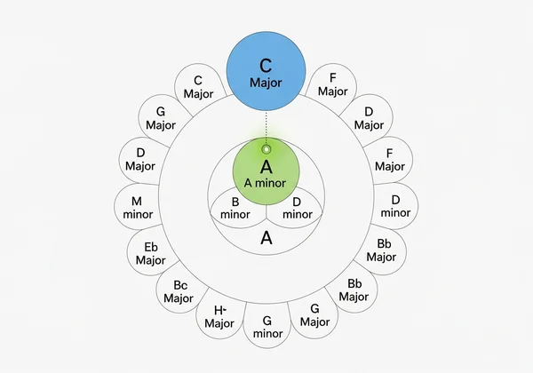Fühlst du dich beim Schreiben von Melodien in Dur festgefahren? Der Quintenzirkel bietet eine brillante Abkürzung in neues emotionales Terrain: die parallele Molltonart. Jede Dur-Tonart hat eine parallele Molltonart mit demselben Vorzeichen (denselben ♯ oder ♭). Auf dem Kreis findest du sie direkt innen neben der Dur-Tonart. Bei C-Dur ist es A-Moll.
