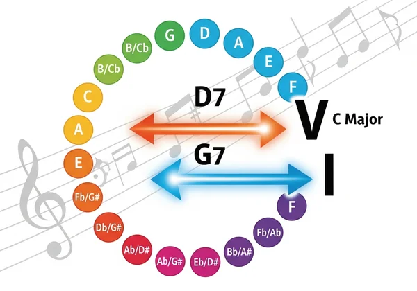 Die wirksamste harmonische Spannung erzeugst du mit dem Dominantakkord (V. Akkord). Der Dominantakkord liegt im Quintenzirkel immer einen Schritt im Uhrzeigersinn von deiner Heiltonart entfernt. In C-Dur ist der Dominantakkord beispielsweise G. Der G7-Akkord enthält besonders ein Tritonus-Intervall, das unbedingt nach C zurückstrebt.